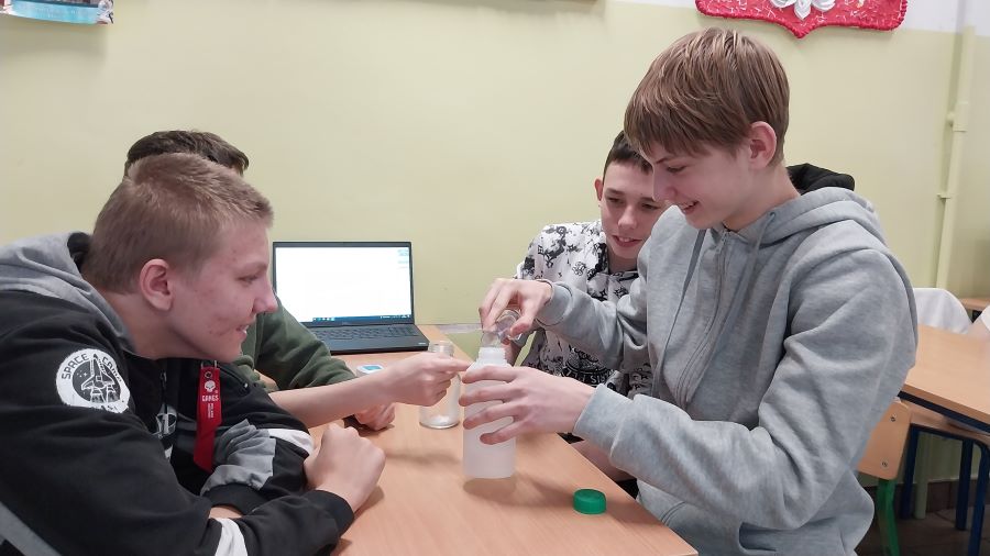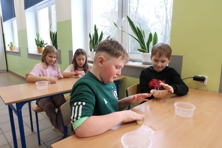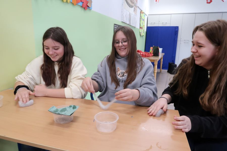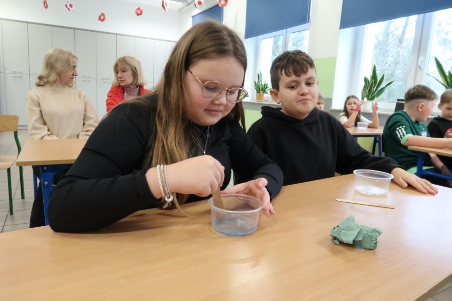 Dodatkową atrakcją warsztatów była możliwość samodzielnego wykonania slime’a. Uczniowie poznali podstawowe zasady mieszania substancji, obserwowali reakcje chemiczne i rozwijali swoje umiejętności manualne. Była to forma nauki przez zabawę, która cieszyła się dużym zainteresowaniem zarówno młodszych, jak i starszych uczestników.